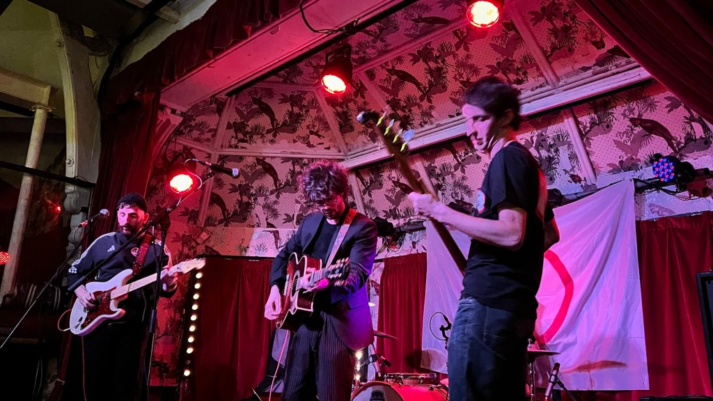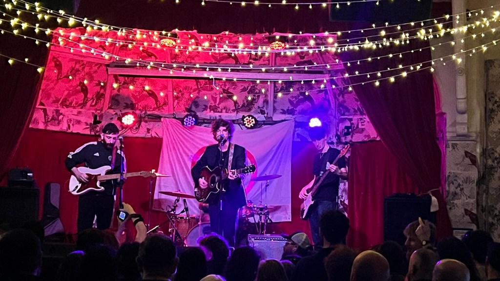 Warm autumn evening in Manchester, stepping into the Band on the Wall. The gig hasn’t started yet. Lo-fi soft rock and shoegaze fill the speakers, red lights bathing the space, slowly getting crowded with well-behaved and calm people. After a quick visit to the washrooms (with hangers on the doors), I felt filled with a yellow glow. I wandered through the place—two different rooms: one with a long main bar and stage serving pizza, draft beers, cocktails, and bags of crisps; the other, big and dark, only open for events, now fully packed with Skinshaper fans. I need a drink. Two different vibes, atmospheres, and decorations, which led me to choose the bar by the gig. Didn’t want to “lose the vibe happening” willing to wait a bunch of minutes for our drinks.