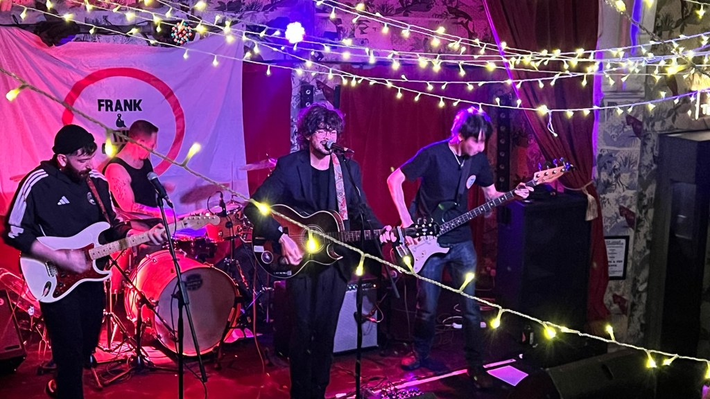 The main room at the Deaf Institute is full; people are talking, but they are attentive to what’s happening on stage. The four members of this wonderful team walk out, led by Frank Oldham, elegantly dressed in a black suit jacket and trousers, his characteristic voluminous curly hair framing him. The theatre is open, and they take a moment to plug in and connect their instruments. From the very first second, Frank’s voice breathes fire. His groove floods the room and makes us all surrender to his honest, direct rock rhythms. Deep lyrics and catchy choruses have us humming along in unison from the first song to the last.