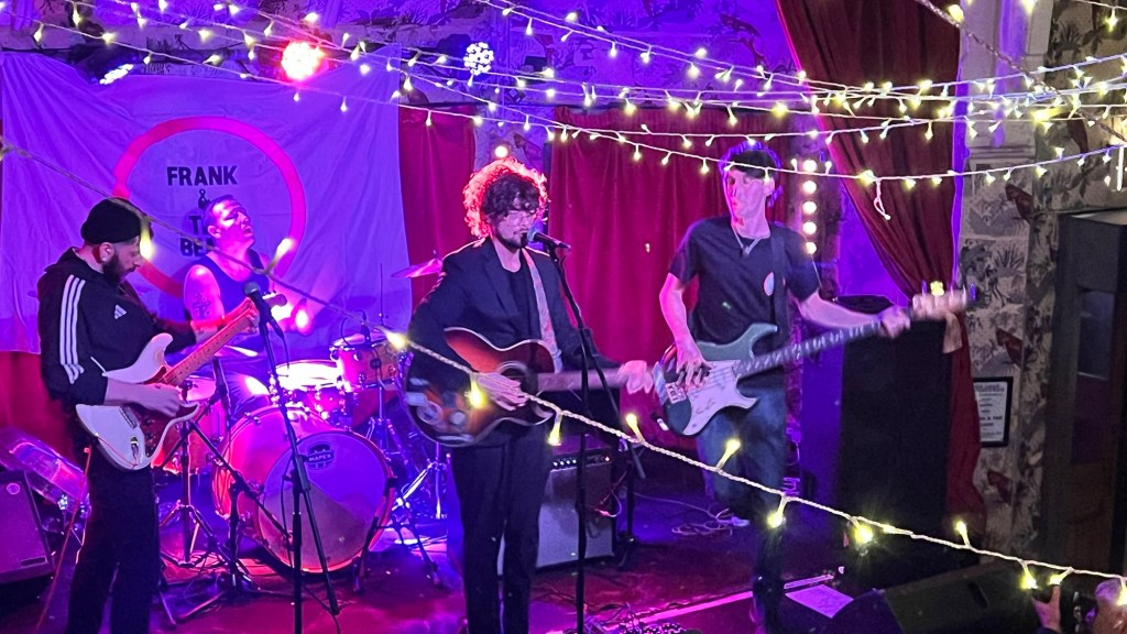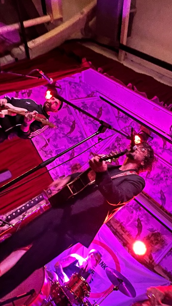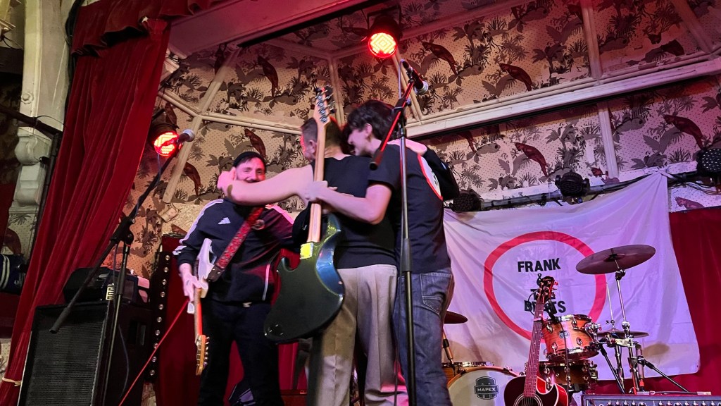 With warmth and complicity, they offer those of us who know them an unreleased song, “Where We Come From”, as reflective as the others and with powerful instrumentation. Their influences move somewhere between Dylan and Fontaines D.C. Surf rhythms and jaggedly beautiful riffs emerge: “Never forget where we come from”… Goosebumps rise all over me as I take in Frank’s energy—a sincere shout accompanied by a band that falls silent in unison, only to explode again as the whole room breaks into dance.